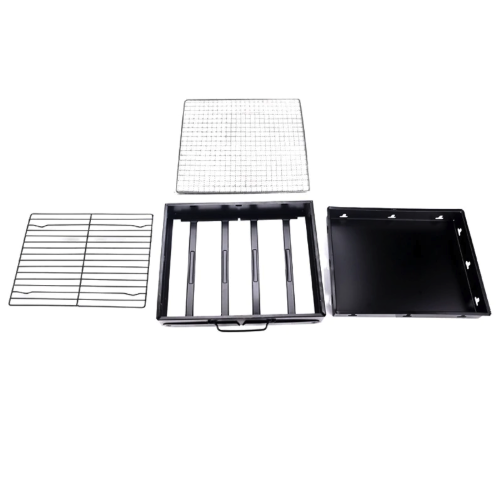 - Made of cold-rolled iron and premium chrome Wire mesh. Heat-resistant and scratch-resistant, not easy to be deformed and rusty, make for burning more vigorously in oxygen. - - Easy to clean as the baking net can be pulled out, and keep safe and healthy as the design of airflow holes and the mortar board can separate the carbon and dust (No ash will be stick to the food).